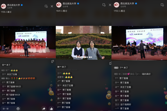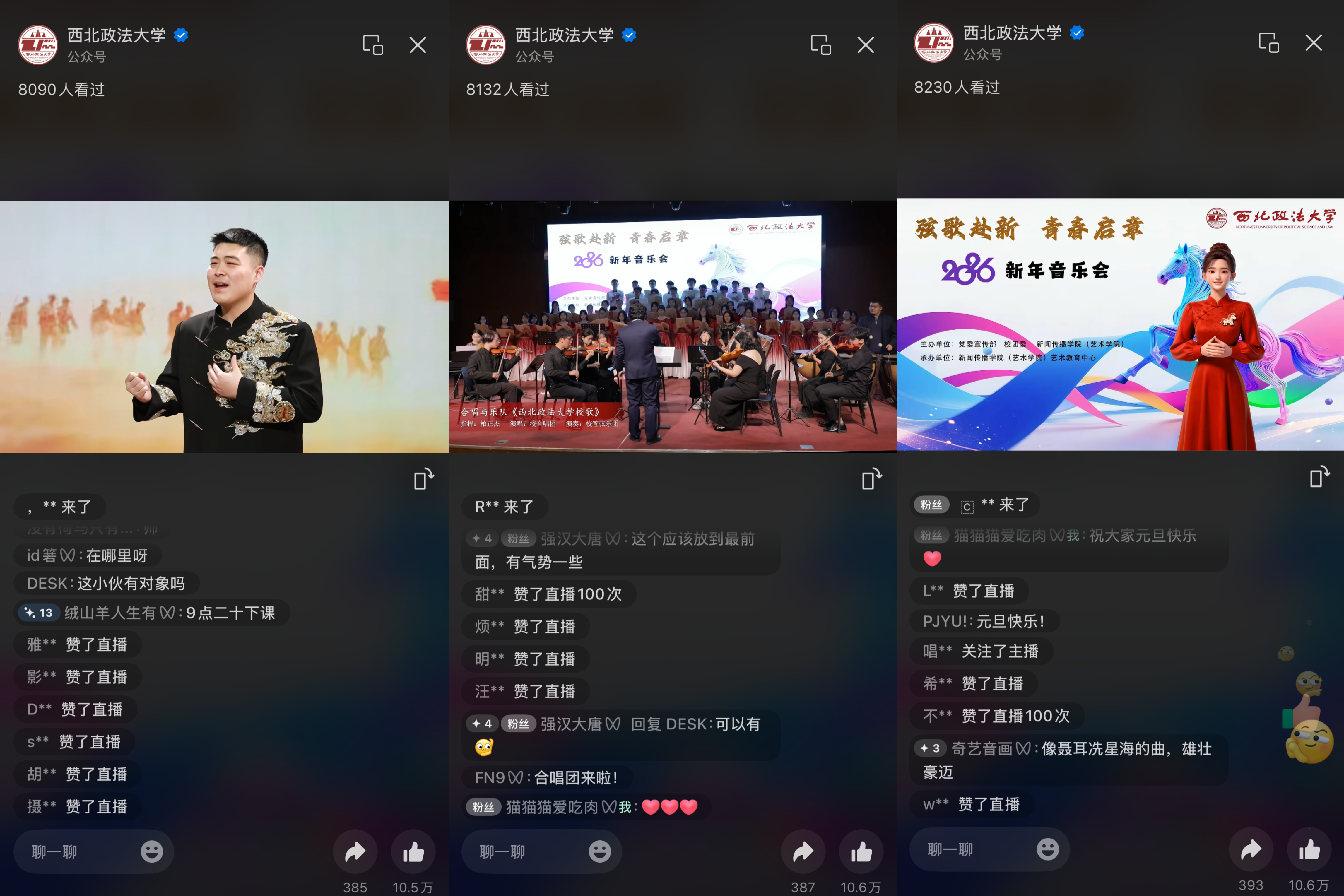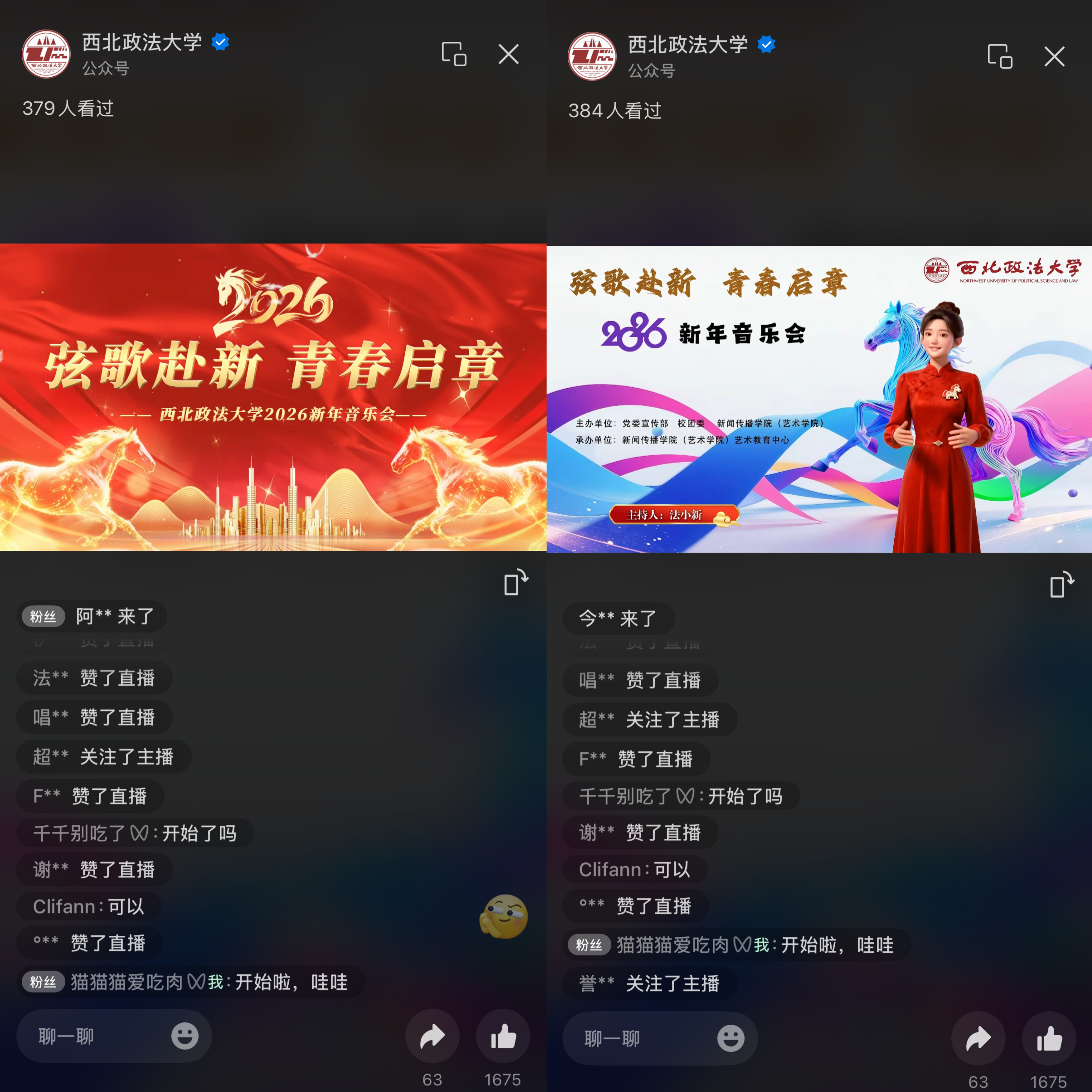 弦歌悠扬辞旧岁,青春激昂启新程。12月31日晚19:50,西北政法大学“弦歌赴新,青春启章”2026新年音乐会通过官方视频号线上直播圆满举行。本场音乐会由党委宣传部、校团委、新闻传播学院(艺术学院)联合主办,新闻传播学院(艺术学院)艺术教育中心承办,数字主持人“法小新”再度亮相,向全校师生、校友致以诚挚的新年祝福。整场音乐会为观众呈现了一场精彩纷呈的视听盛宴,共8200余人在线观看,收获点赞10万次,温情与暖意跨越屏幕传递。