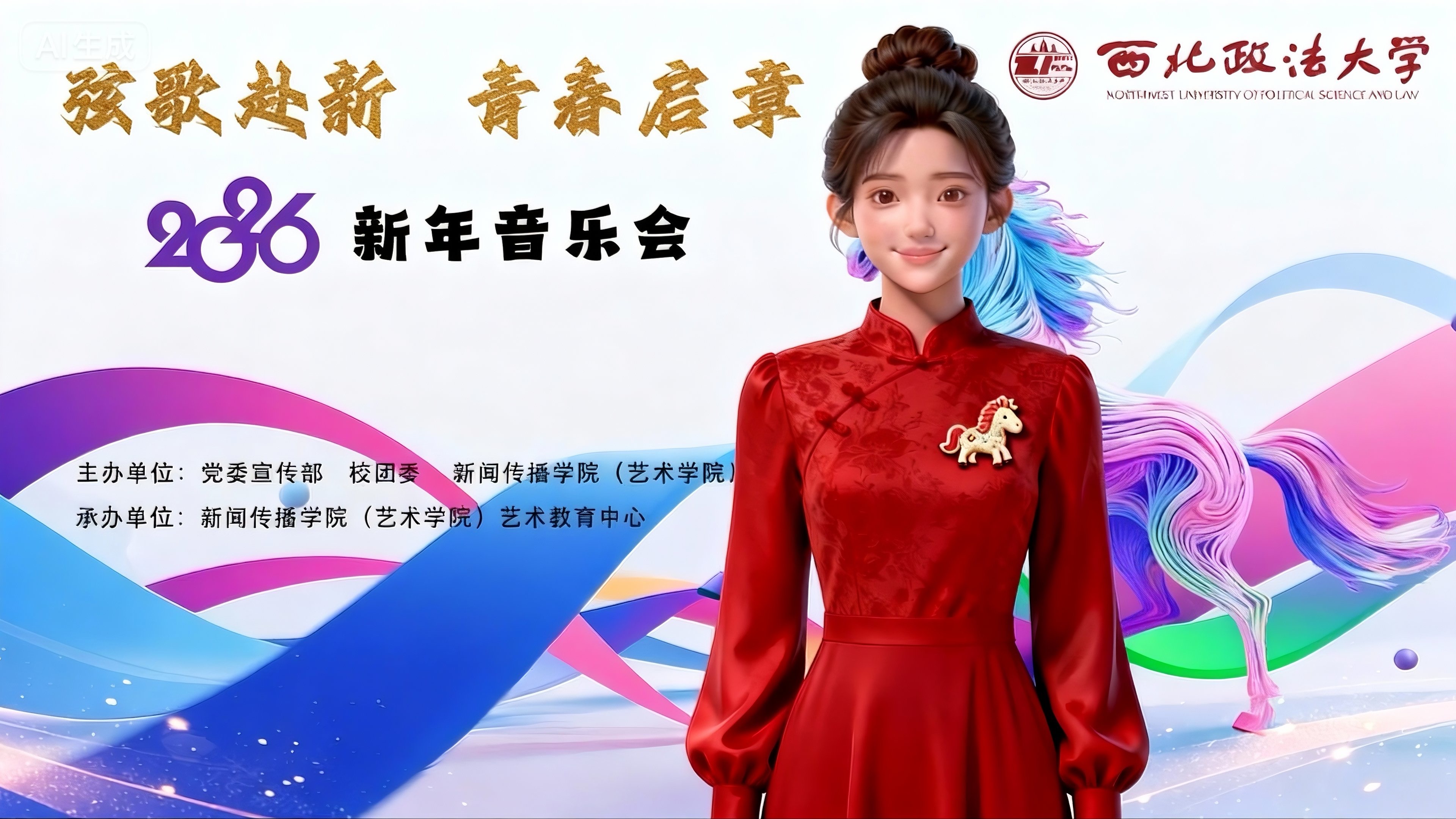 在科技与艺术融合的新时代背景下,西北政法大学2026新年音乐会将于年底直播。本次音乐会突破传统形式,引入由新闻传播学院(艺术学院)AIGC团队自主研发打造的数字主持人——“法小新”,为整场活动增添了浓厚的创新色彩与人文温度。